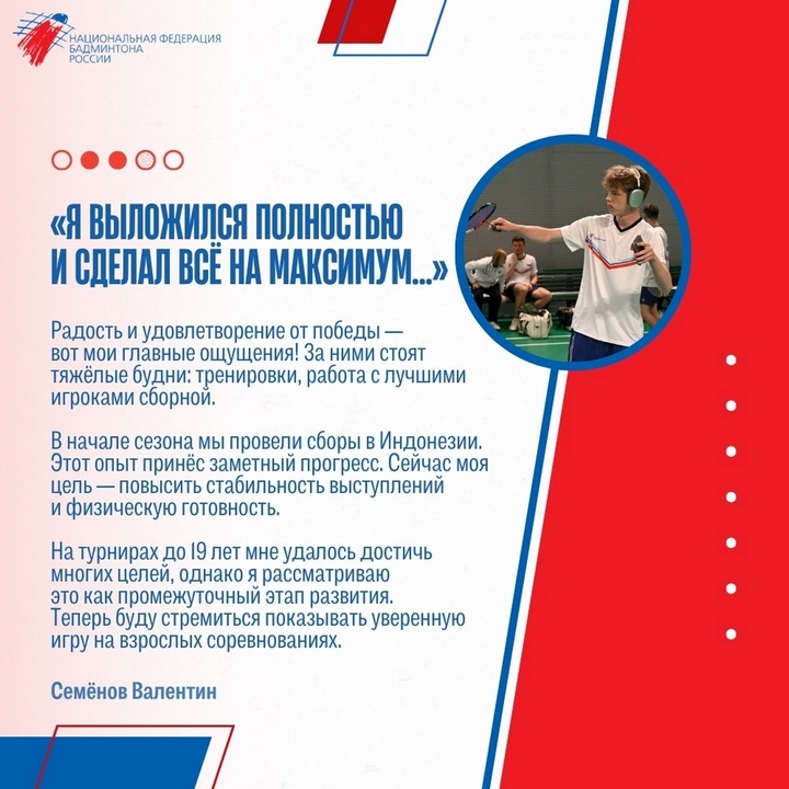 В Казани в «Центре бадминтона» завершилось лично-командное первенство России по бадминтону среди юниоров и юниорок до 19 лет. Абсолютным чемпионом личного первенства стал представитель Московской области Валентин Семёнов, завоевавший золотые медали во всех трех разрядах – одиночном, парном мужском и смешанном.